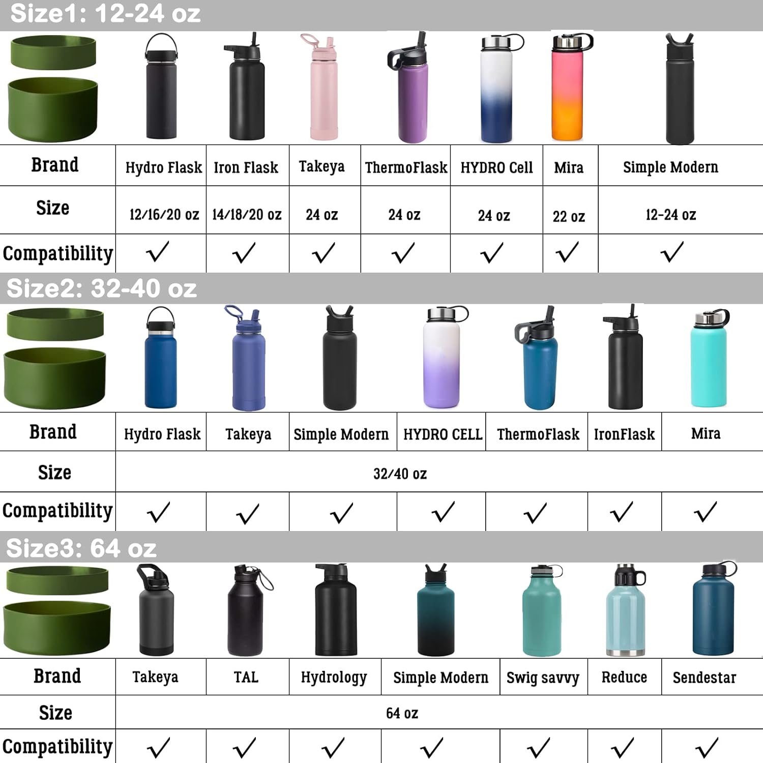 - Widely-used:Our anti slip silicone bands for water bottle Compatible with Iron Flask, fit Hydro Flask, fit Simple Modern, fit Vmini, fit HYDRO CELL, fit MIRA, fit Thermoflask, fit Takeya, fit Hydrology, fit TAL, fit Liquid Savvy, fit Greant and more stainless steel sports water bottles, also as a bowl for pet. We offer 3 size: 2.91”/3.62”/4.72”. Meet the needs of the size. Suitable for hiking, climbing, camping, yoga and more outdoor activities