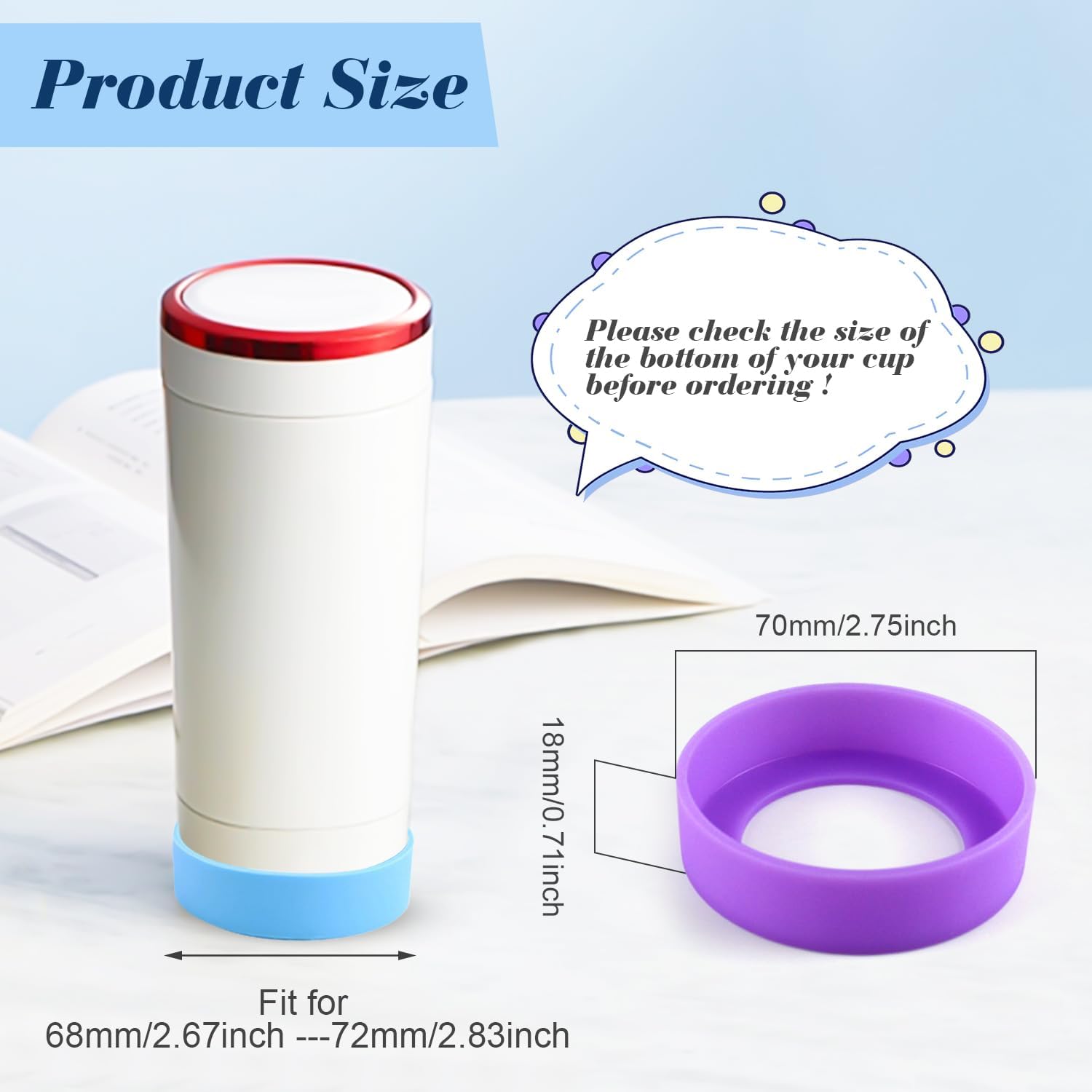 - The diameter of silicone tumbler bumper is measured approx. 70*70mm/2.75*2.75inch. Please carefully confirm the bottom width of the new water bottle before placing an order.