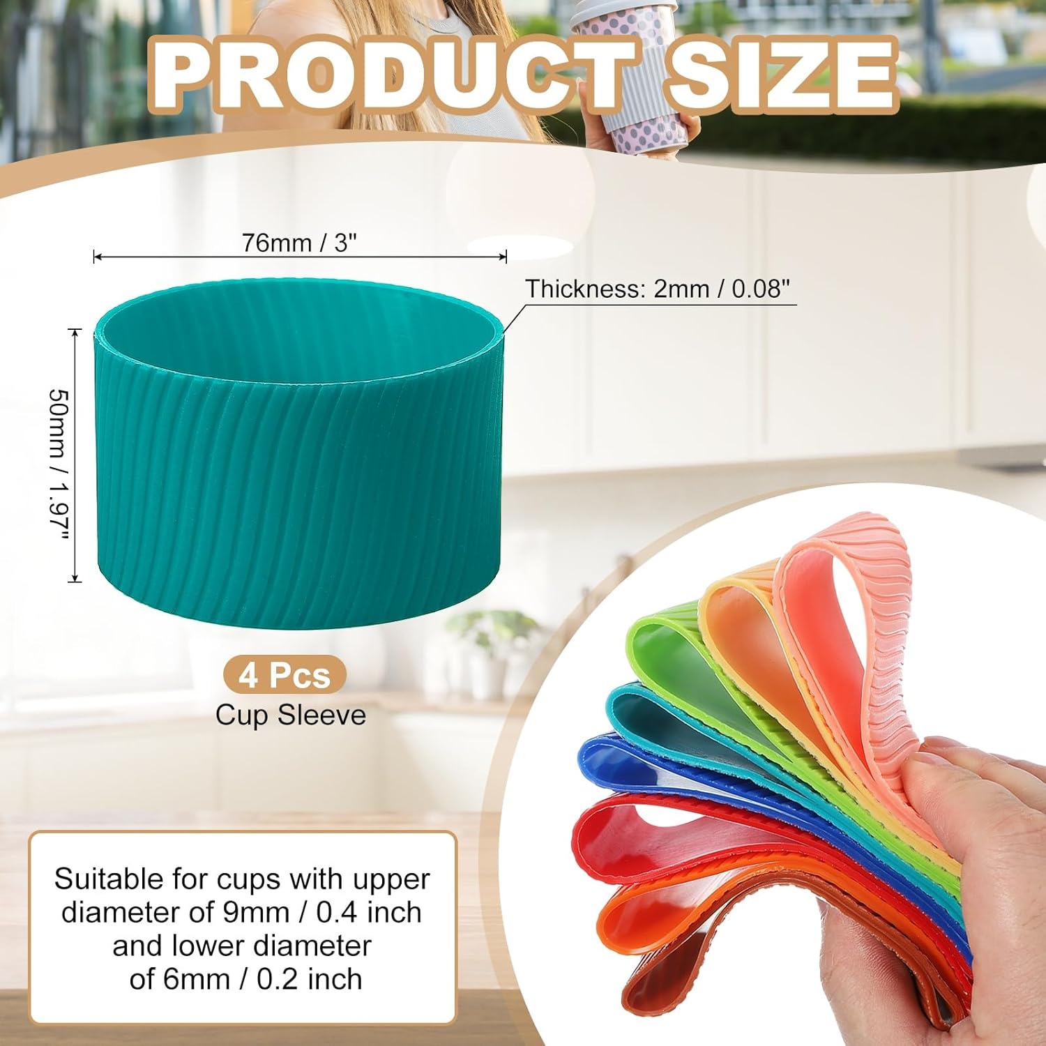 - Specification: Color: Lake Green; Material: Silicone; Style: Straight Twill; High: 50mm / 1.97 inch;Diameter: 76mm / 3 inch;Thickness: 2mm / 0.08 inch; Applicable Cup Upper Diameter: 9mm / 0.4 inch; Applicable Cup Lower Diameter: 6mm / 0.2 inch; Package Contents: 4 x Cup Sleeve